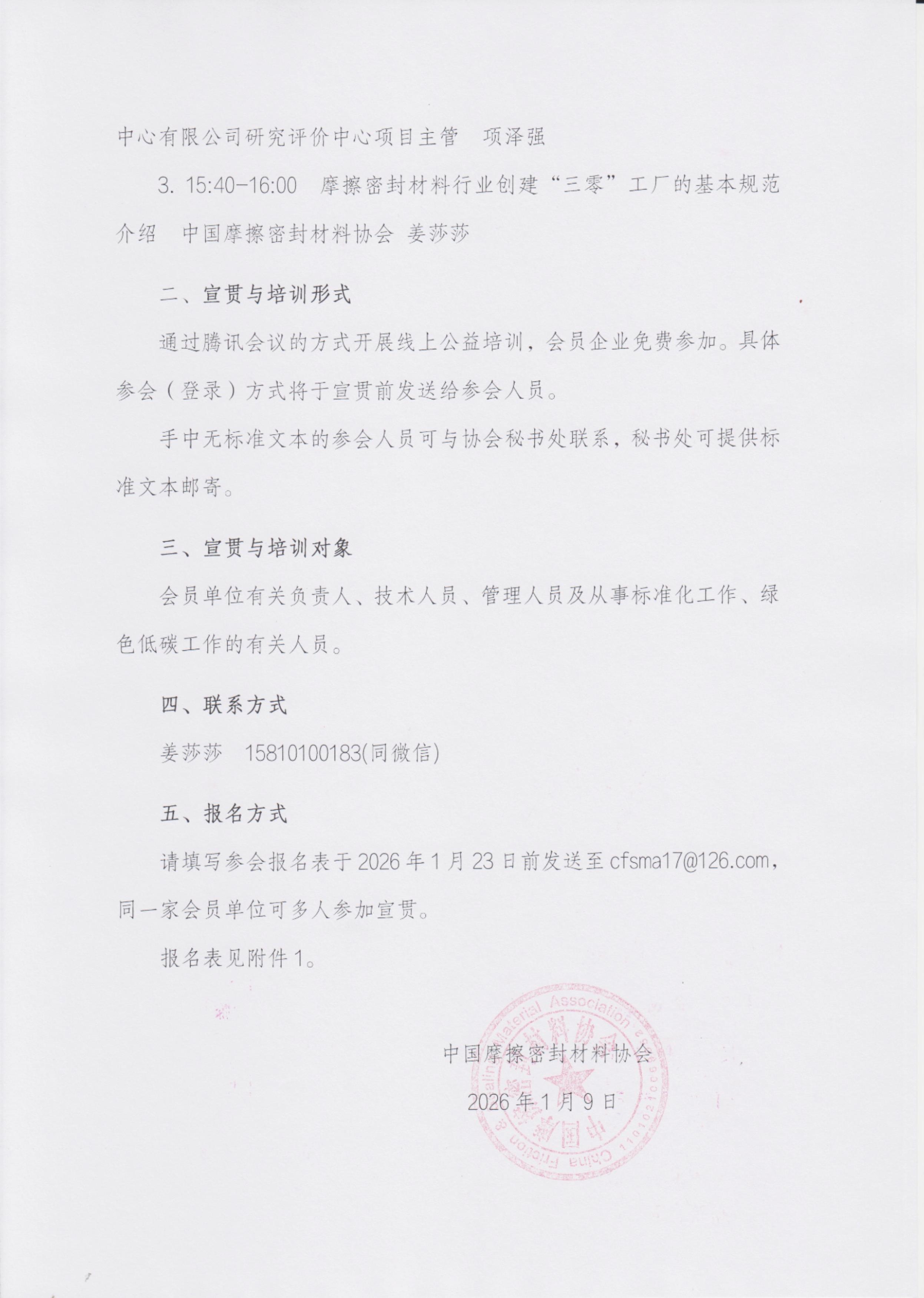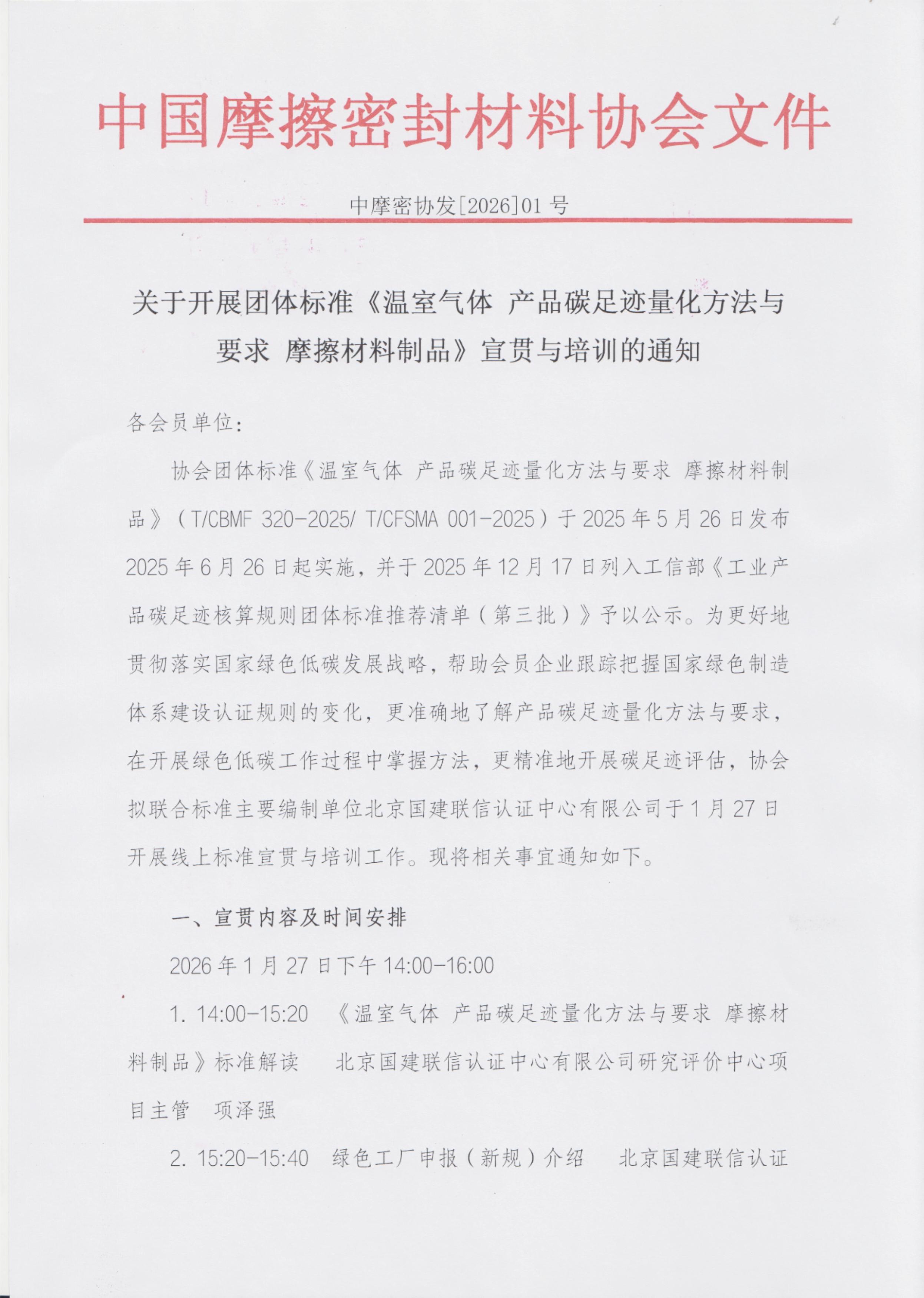 关于开展团体标准《温室气体 产品碳足迹量化方法与要求 摩擦材料制品》宣贯与培训的通知